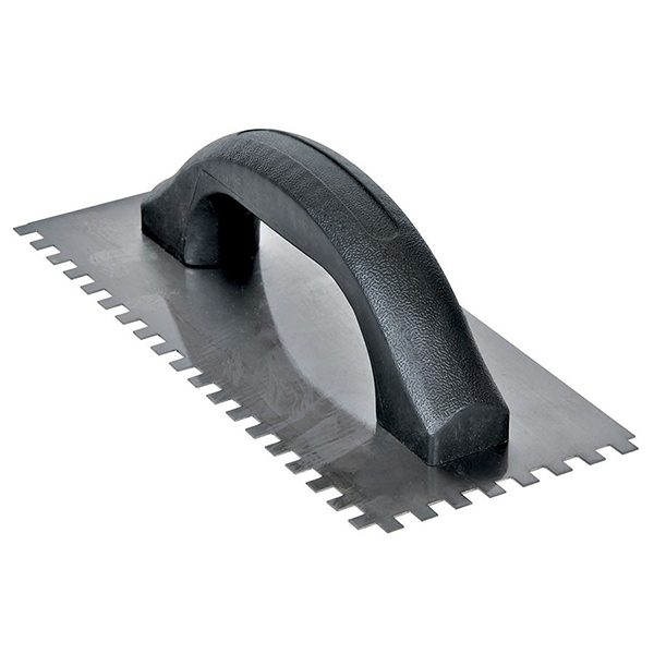 This trowel has small square 6mm notches, making easy work of applying adhesives for mosaics and small tiles, particularly in larger areas. The hardened and tempered steel blade ensures toughness and durability, and the large soft-grip handle provides extra comfort.